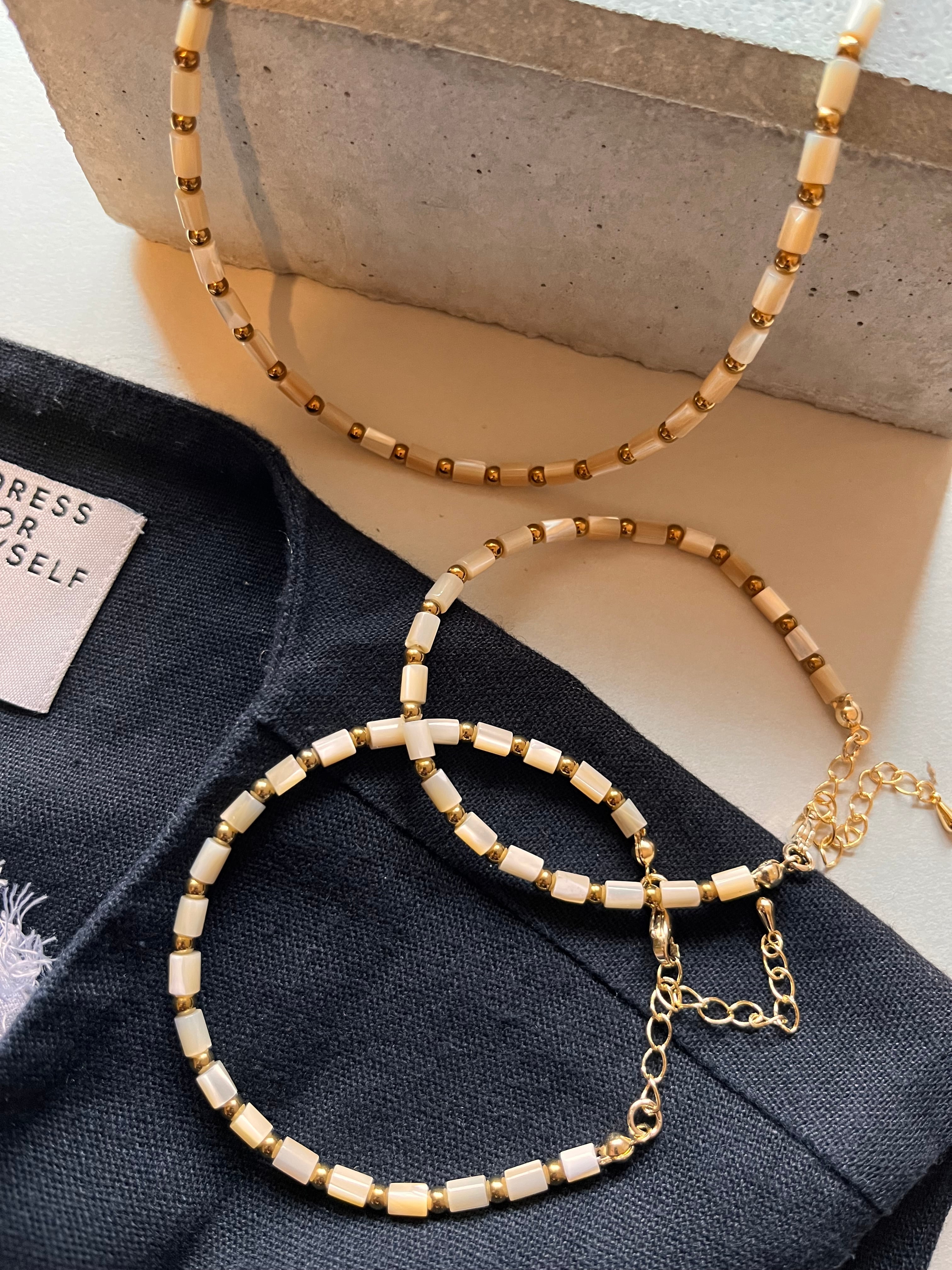 天然石、マザーオブパール、淡水パールを 使用したカジュアル、フォーマルシーンにも お使いいただけるデザインです。 ボタンを使用した揺れるゴールドプレートが ゴージャス感を演出します。 ピアス/イヤリングをお選び頂けます。